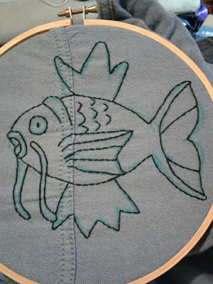 JackalopePurple/Brown Thread on Yellow Fabric2015ChimeraBlue/Brown Threadon Fabric2016BarkPink/Yellow Thread on Blue Check Fabric2016Mountain GoatBlue/Purple/Pink Thread on Neutral Fabric2017Flowers on Vintage ShirtMulti color Satin Stitch2017Skull and Circles WipMetallic Embroidery Thread2019Yu Yu Hakusho LogoRed/White/Gray Satin Stitch2016Stitch ShowcaseMulti Colored Thread on Stretch Fabric2016Moon and CloudsBeads and Thread2019Skull and Circles Planning SketchInk2016